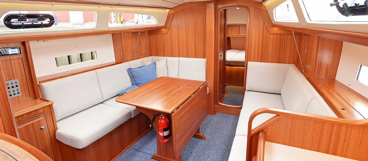 The interior is unusually airy. The settees in the saloon are 2.00 m long and further aft than usual. It gives particularly good width and volume to the interior. The mast position is out of the way right aft of the main bulkhead. Through the special layout, the galley also contributes to an unusually generous airiness in the saloon. The galley is seagoing and out of the way from the natural flow through the boat. The person in the galley does not stand in the way of anyone who wants to enter the aft cabin. There are deep double sinks and a large fridge. The work surface in the galley is already as standard in solid composite stone.
