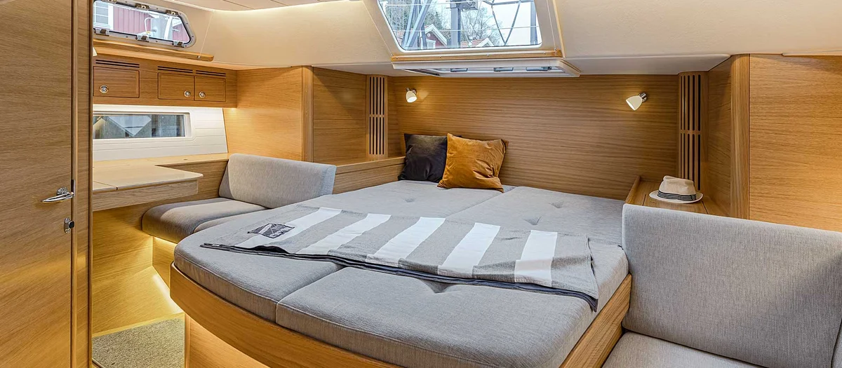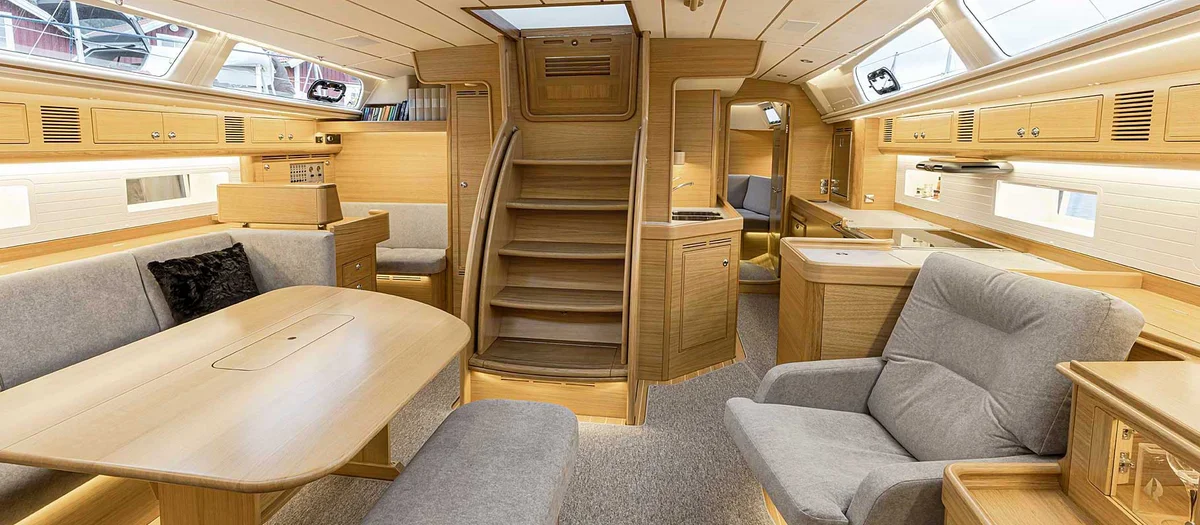 The interior has lots of natural light and indirect led lights as well. There is good ventilation. The layout is generous and roomy, with lots of elbow room. The storage facilities are generous too. The sturdy woodwork has the well renowned Hallberg-Rassy finish.